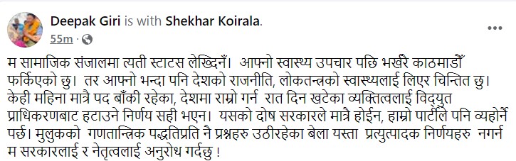 नेता गिरीले लेख्नुभएको ‘म सामाजिक संजालमा त्यति स्टाटस लेख्दिनँ।  आफ्नो स्वास्थ्य उपचार पछि भर्खरै काठमाडौँ फर्किएको छु ।  तर आफ्नो भन्दा पनि देशको राजनीति, लोकतन्त्रको स्वास्थ्यलाई लिएर चिन्तित छु। केही महिना मात्रै पद बाँकी रहेका, देशमा राम्रो गर्न  रात दिन खटेका व्यक्तित्वलाई विद्युत प्राधिकरणबाट हटाउने निर्णय सही भएन।  यसको दोष सरकारले मात्रै होइन्, हाम्रो पार्टीले पनि व्यहोर्नै पर्छ। मुलुकको  गणतान्त्रिक पद्धतिप्रति नै प्रश्नहरू उठिरहेका बेला यस्ता  प्रत्युत्पादक निर्णयहरू  नगर्न म सरकारलाई र नेतृत्वलाई अनुरोध गर्दछु !’
