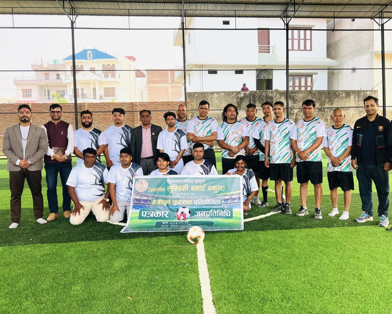 तुलसीपुर, ५ बैशाख । प्रस्तावित लुम्बिनी स्मार्ट स्कुल तुलसीपुर ९ को आयोजनामा हिजो शुक्रवार भएको तुलसीपुर उपमहानगरपालिकाका जनप्रतिनिधि र पत्रकारबीचको मैत्रीपूर्ण फुटसल प्रतियोगितामा जनप्रतिनिधिको समुहको विजयी भएको छ । फुटसल खेलमा जनप्रतिनिधि समुहले ५–२ गोल अन्तरले पत्रकारको समुहलाई पराजित गरेको हो ।