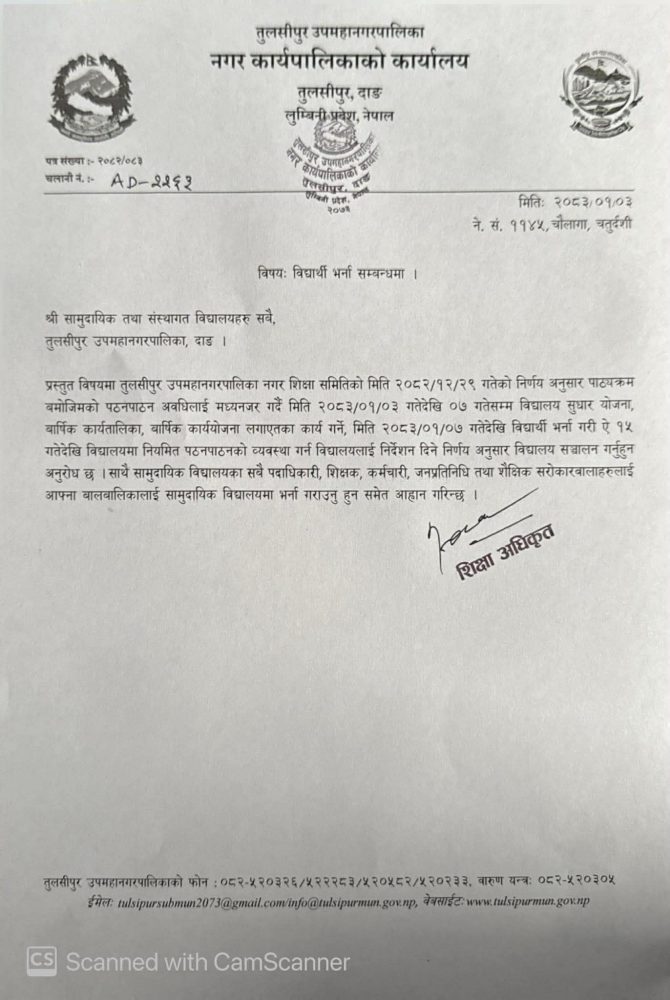 तुलसीपुर उपमहानगर शिक्षा समितिको मिति २०८२/१२/२९ गते बसेको बैठकको निर्णय अनुसार ७ गतेदेखी भर्ना सुरु गरिएको थियो । सोहि अनुसार तुलसीपुर क्षेत्रका सामुदायिक तथा संस्थागत विद्यालयले विद्यार्थी भर्ना अभियान सुरु गरी आजदेखी पढाई सुचारु गरेका छन् ।